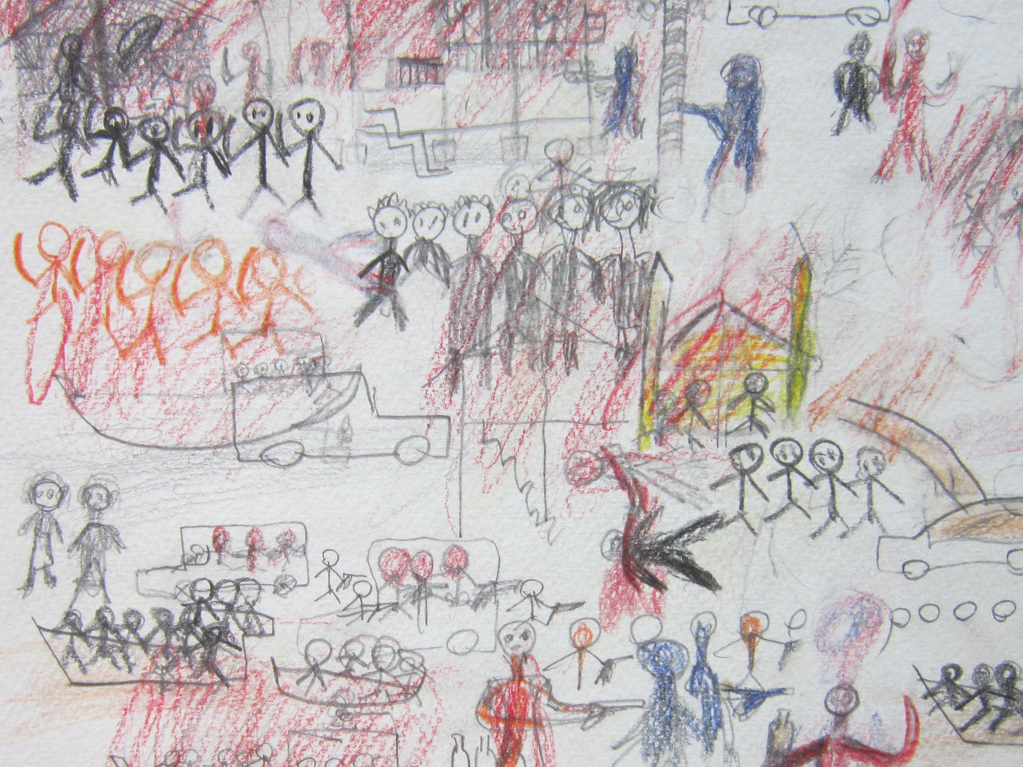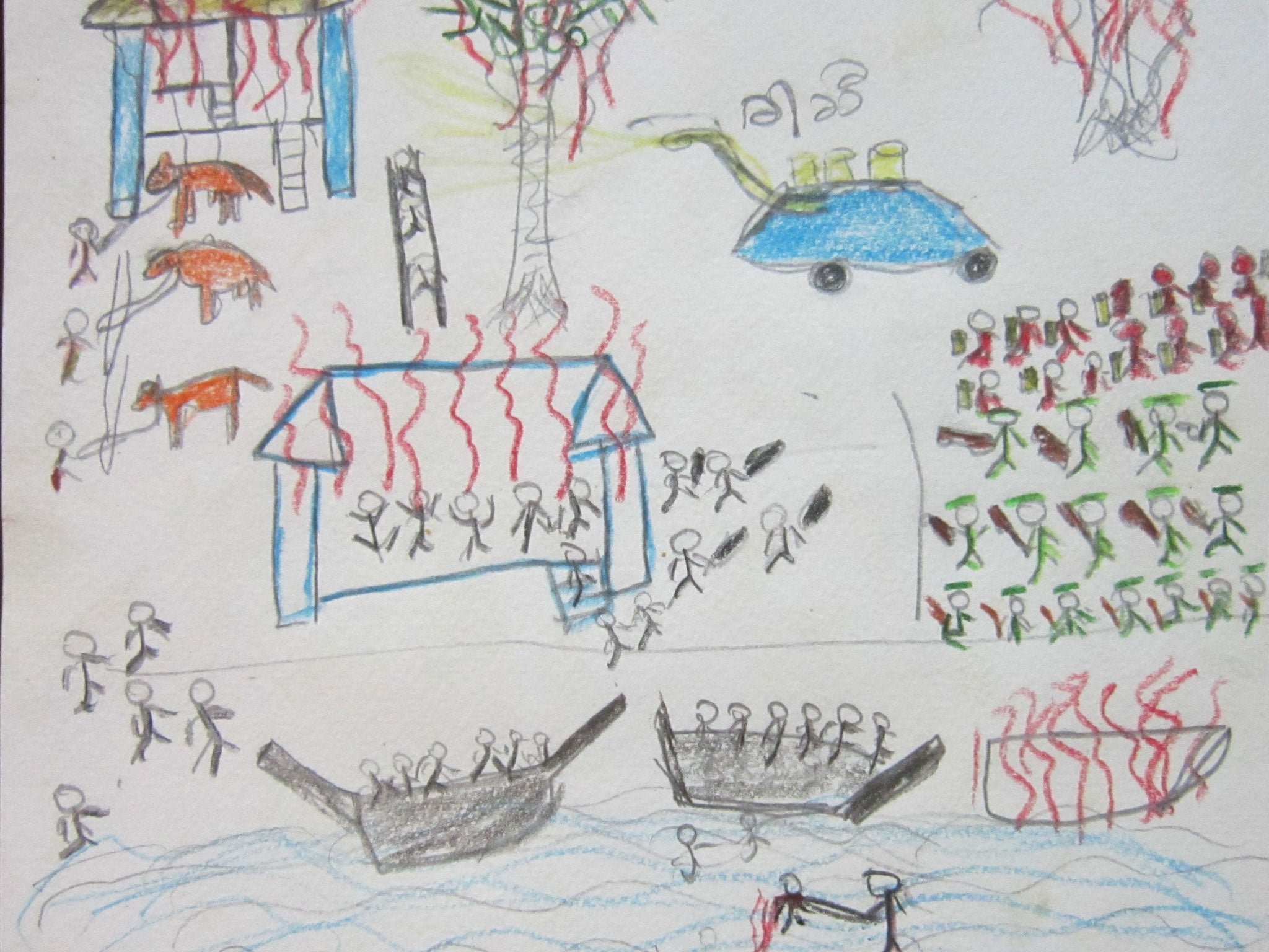 One drawing shows houses on fire, the sky black with smoke. Another portrays gunmen aiming and firing their weapons. All contain images of people fleeing, running, frantically clambering into boats and leaving their homes. They are drawn in crayon by children.