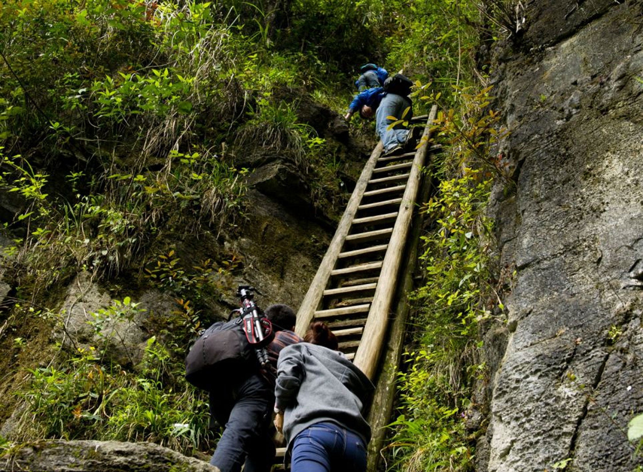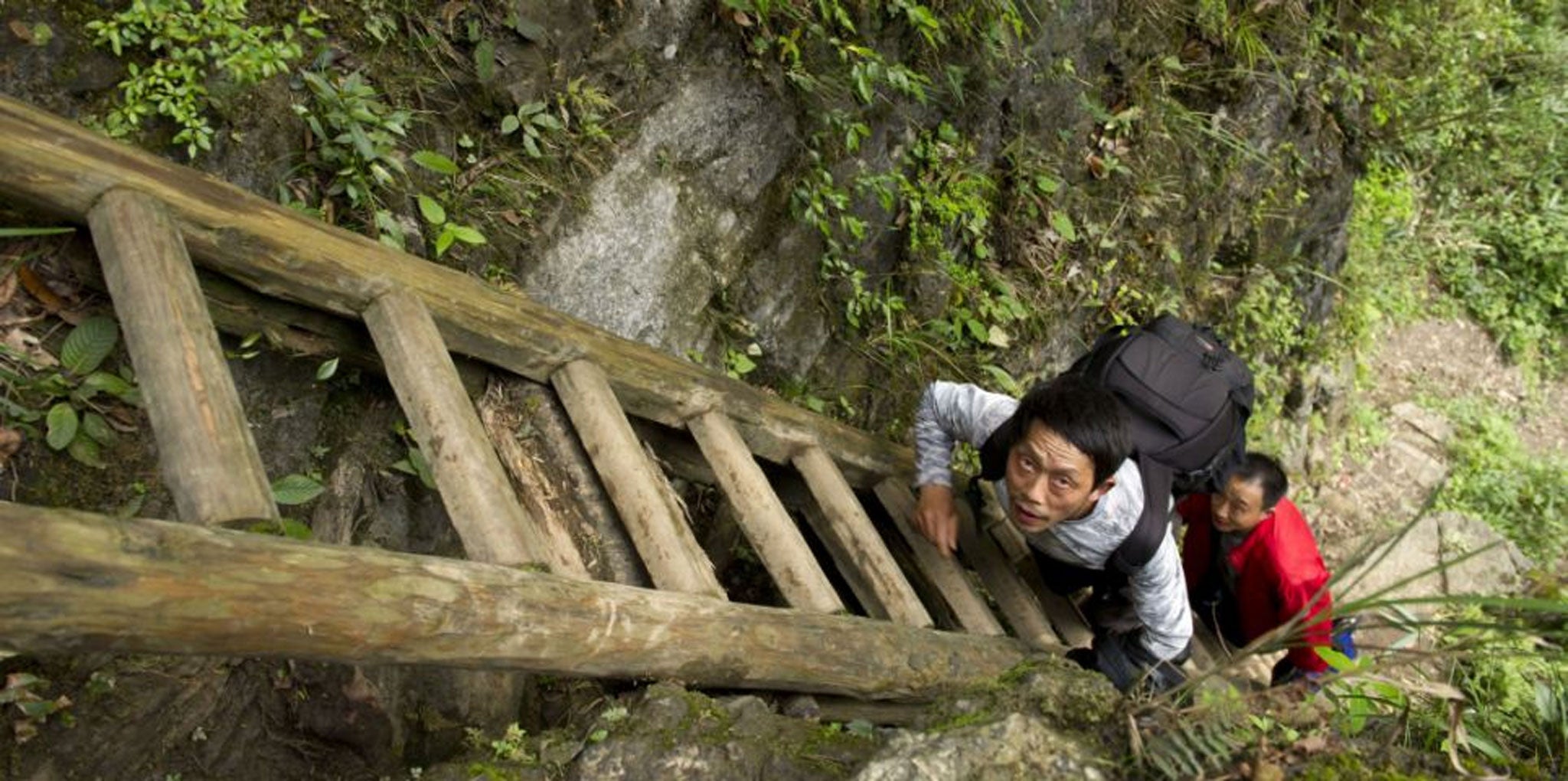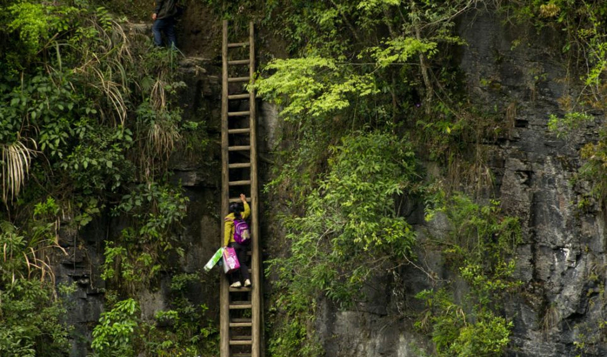 Students in the village of Zhang Jiawan, in the remote Badagong Mountains in Hunan province,have to make a demanding daily descent down a series of rickety, unsecured ladders to reach their school.