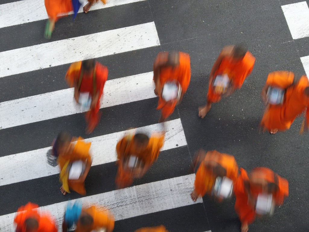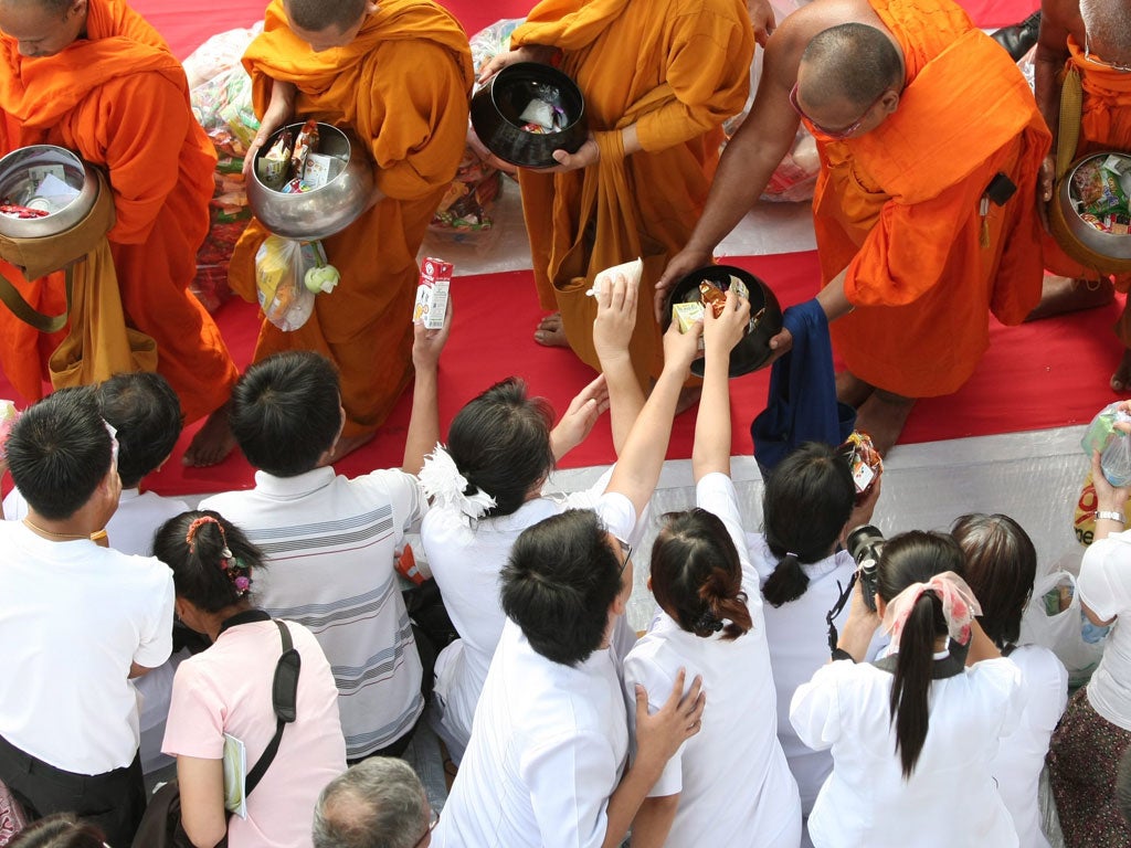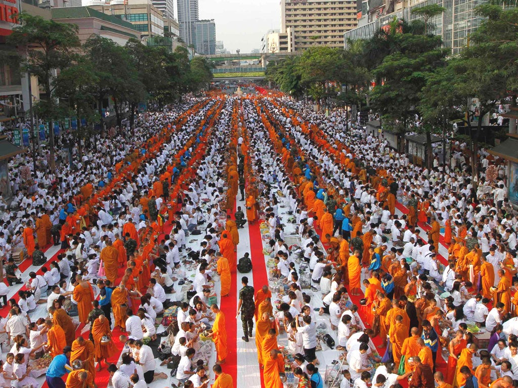 Thai Buddhist monks gather to receive food at an alms-giving ceremony at the Ratchaprasong crossroads in central Bangkok yesterday. About 22,600 monks held the ceremony to mark the 2,600th anniversary of the enlightenment of Lord Buddha.