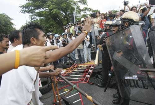 Earlier today, many of the demonstrators - some armed with golf clubs, batons and bamboo sticks - had pushed up to 400 officers out of the Government House grounds in Bangkok, and then celebrated the ousting of the police by dancing to rock music.
