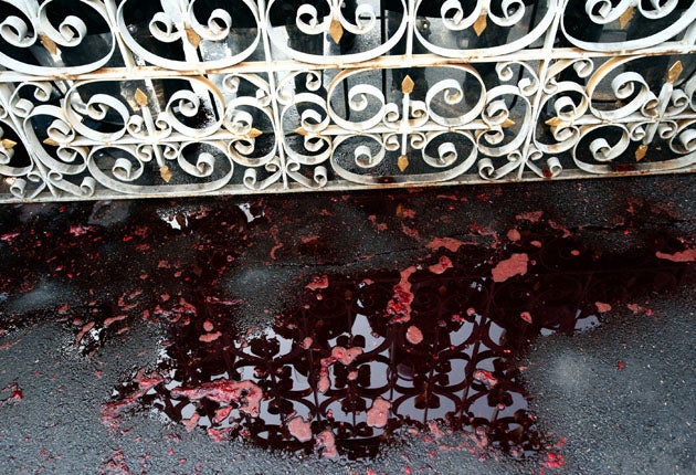 Hundreds of protesters then marched and rode pickup trucks and motorcycles to the nearby ruling Democrat Party headquarters and splashed several more jugs of blood on the pavement outside. Some tried to push their way past riot police but eventually dispersed.