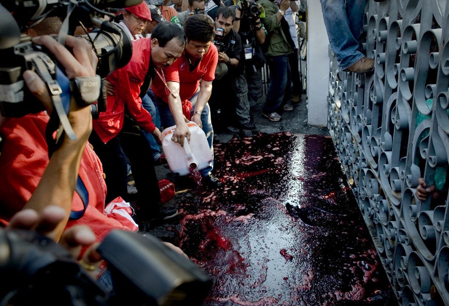 The "blood sacrifice" tactic has been slammed by the Red Cross as wasteful and unhygienic since diseases like hepatitis and HIV-AIDS can be spread if needles used to draw the blood are reused. Protest leaders insisted they would use new needles for each person.