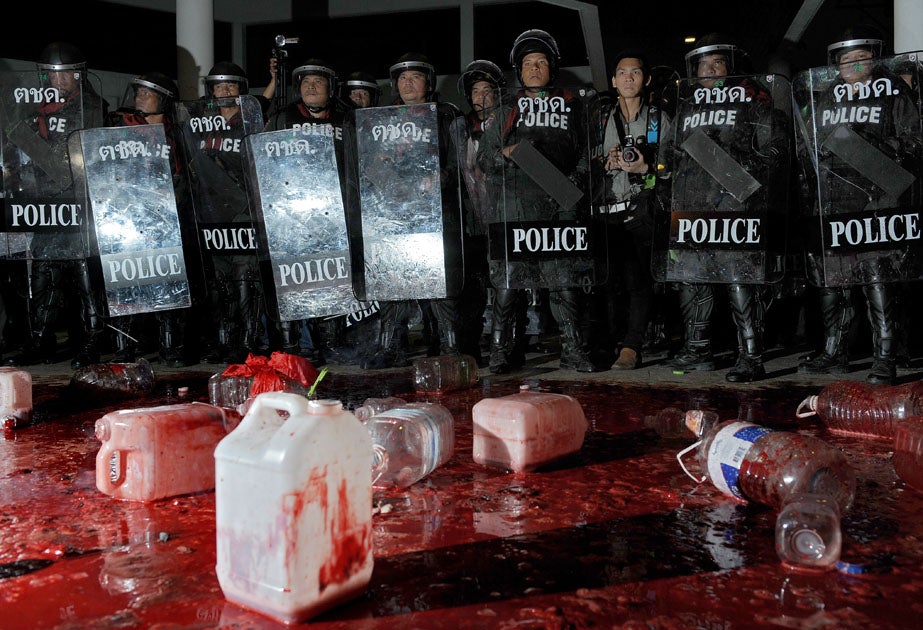 Thai protesters poured several jugs of their own blood at the front gate of the government headquarters and outside the ruling party's offices today in a symbolic sacrifice to press their demands for new elections.
