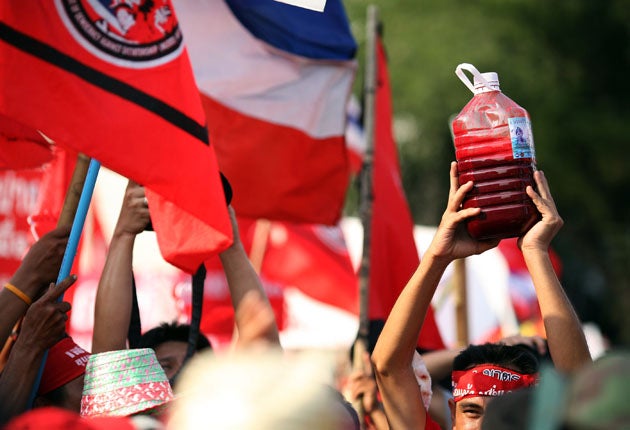 "The blood of the common people is mixing together to fight for democracy," Nattawut Saikua, one of the protest leaders, told cheering supporters. "When Abhisit works in his office, he will be reminded that he is sitting on the people's blood."
