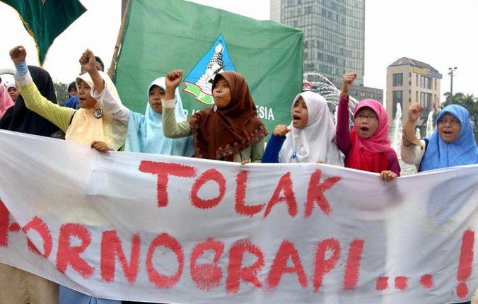 The law is, on paper, remarkably powerful. It defines pornography as any form of expression, including "bodily movements", deemed to "violate community morality". The law was vigorously opposed by secularists and the religious minorities that make up 10 per cent of Indonesia's 234 million citizens. After it was passed, there were hopes it would, like many laws, be rendered a dead letter by the unwieldy and corrupt system of law enforcement.