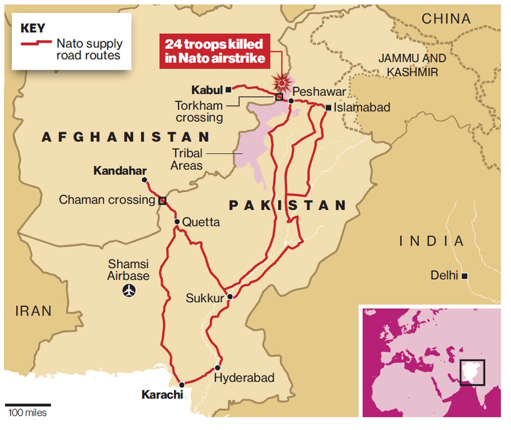 An angry crowd of at least a thousand people was gathered through most of yesterday outside the US consulate in Karachi. Much of the nation was gripped by live television coverage of the funerals of the soldiers killed in the strike. Lorries filled with supplies for Nato troops were already backed up at the two border crossings closed down by the government at Torkham and Chaman. The US has two weeks to leave the Shamsi airbase, which is used for drone operations.