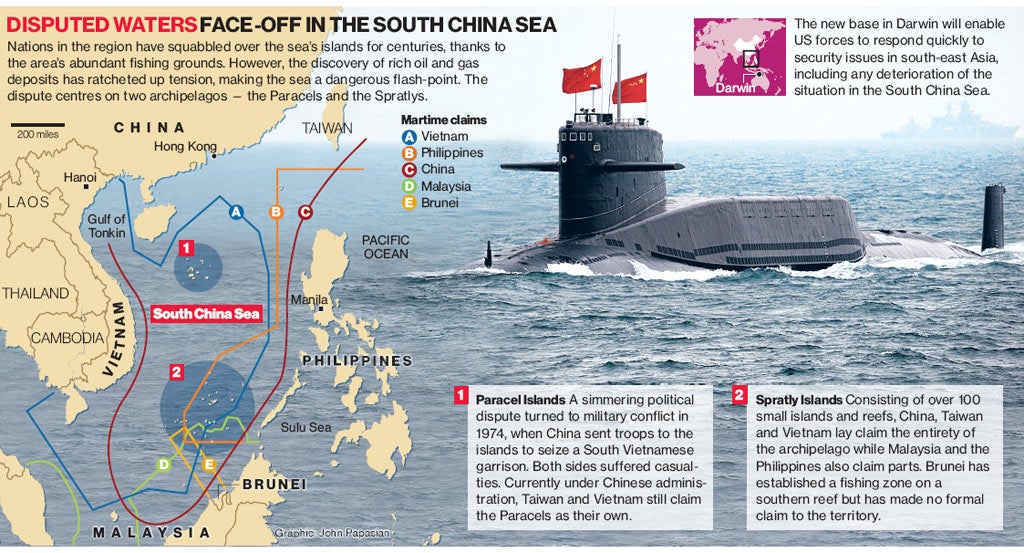 The plan was outlined by Mr Obama during a lightning visit to Australia, marking the 60th anniversary of a security pact between the two countries. Immediately, China questioned whether it was "in the interest of countries within this region" to intensify military alliances. Security analysts said it reflected the strategic "pivot" by the US away from the Middle East and the war on terror towards Asia, where China is seeking to usurp its long-standing dominance. Beijing claims sovereignty over the entire South China Sea, and has reignited old territorial disputes, including over the potentially resource-rich Spratly and Paracel islands.