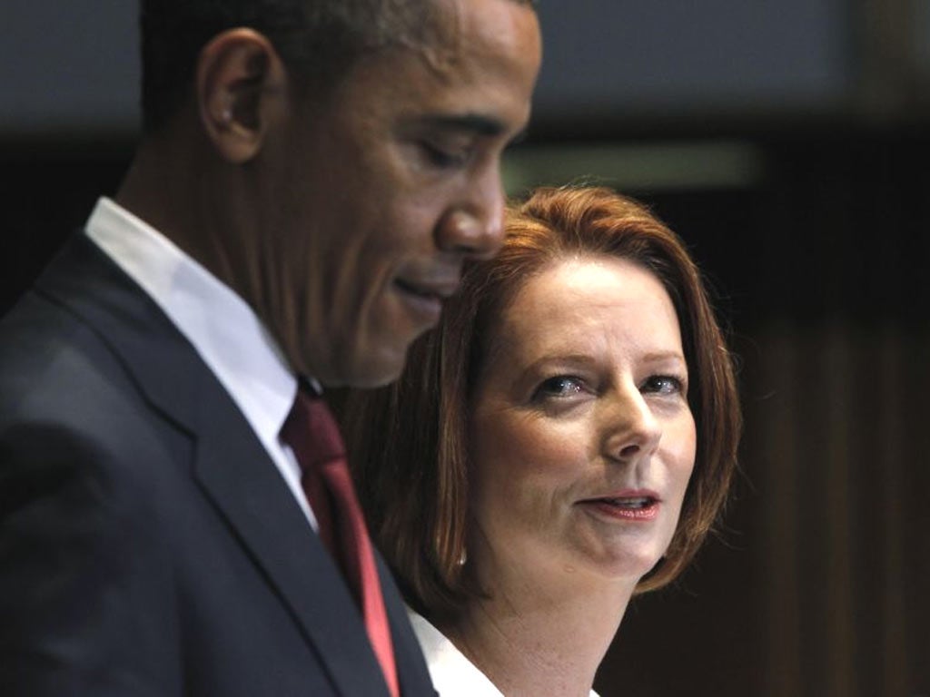 At a news conference in Canberra with the Australian Prime Minister, Julia Gillard, he said: "The notion that we fear China is mistaken. The notion that we are looking to exclude China is mistaken. We welcome a rising, peaceful China." The US deployment to Australia, the largest since the Second World War, will begin next year, with about 250 Marines sent to Darwin on six-month rotations and troop numbers building to 2,500 by 2016.