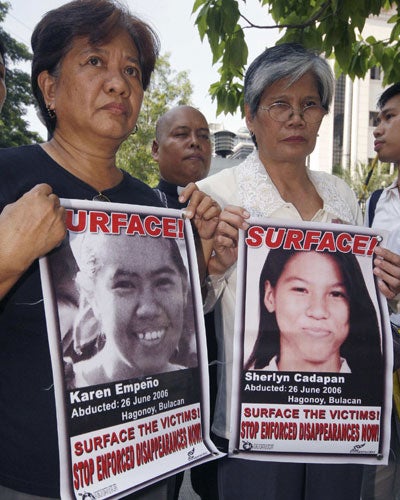 It was 2am when Karen Empeno, 24, and Sherlyn Kadapan, 23, were dragged from their beds by armed men. They were tied up and thrown into the back of a jeep. That was on 26 June 2006. The girls' families have not seen them since.
