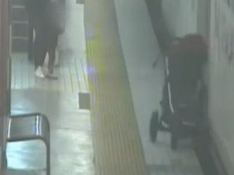 The pram is sent spinning to the floor and slides along the platform for several metres.