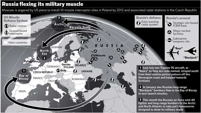 Russian bomber patrols have recently been made over the Atlantic, Pacific and Arctic oceans and approached close to the borders of Nato airspace. Two Russian Tupolev-95 aircraft strayed south from their routine patrol pattern off the Norwegian coast and headed towards Scotland last September.