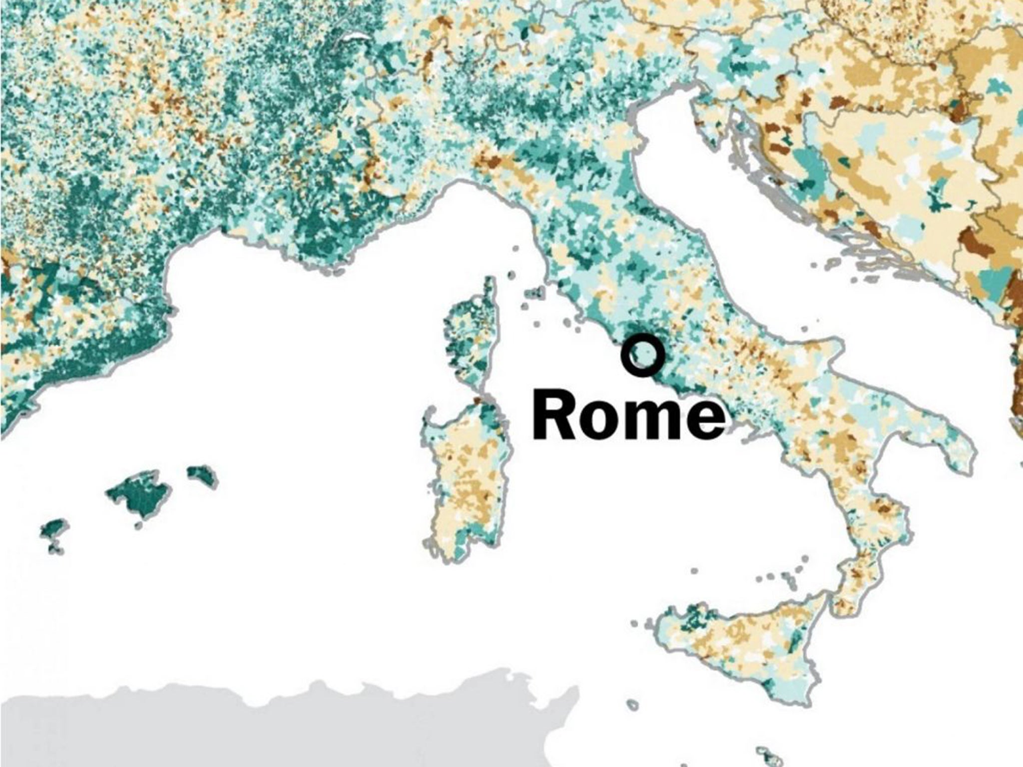 This map compares demographic trends all over Europe between 2001 and 2011. Areas colored green had an average annual increase in population over that time span, and areas colored brown experienced a decline in population. In areas colored white, no significant change occurred.