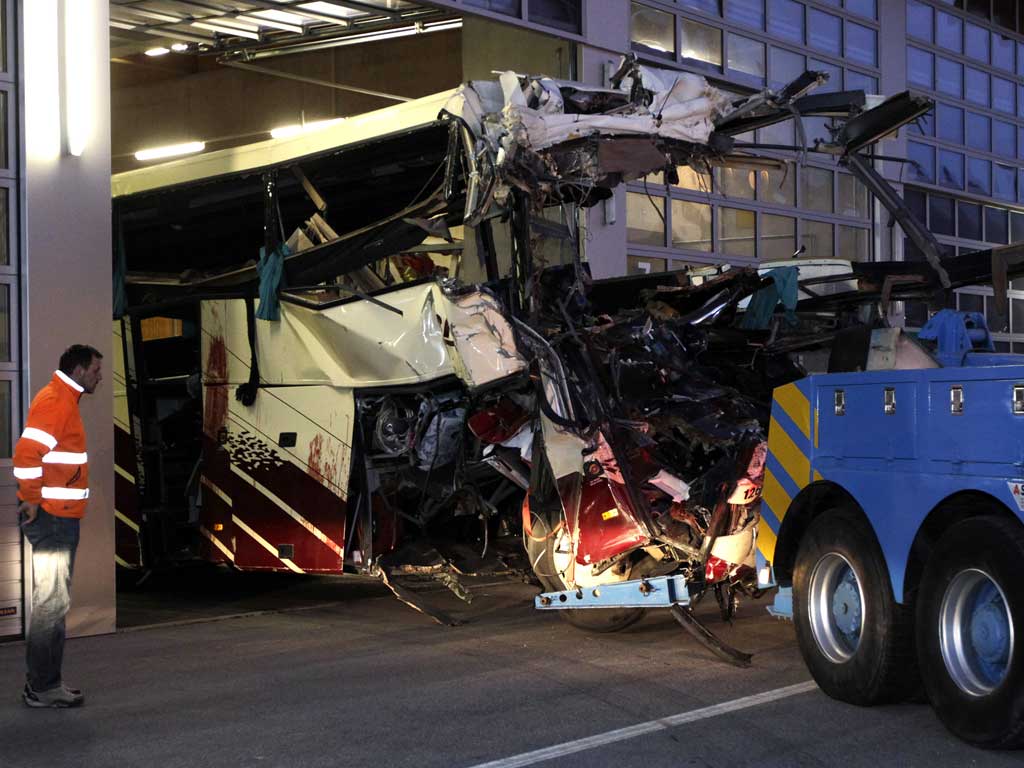 In a statement, Swiss police said "The bus hit the barrier stones on the right side of the road. It then hit the tunnel wall head on in an emergency stop space…Because of the strong impact the bus was badly damaged and several passengers were trapped in the wreckage."
