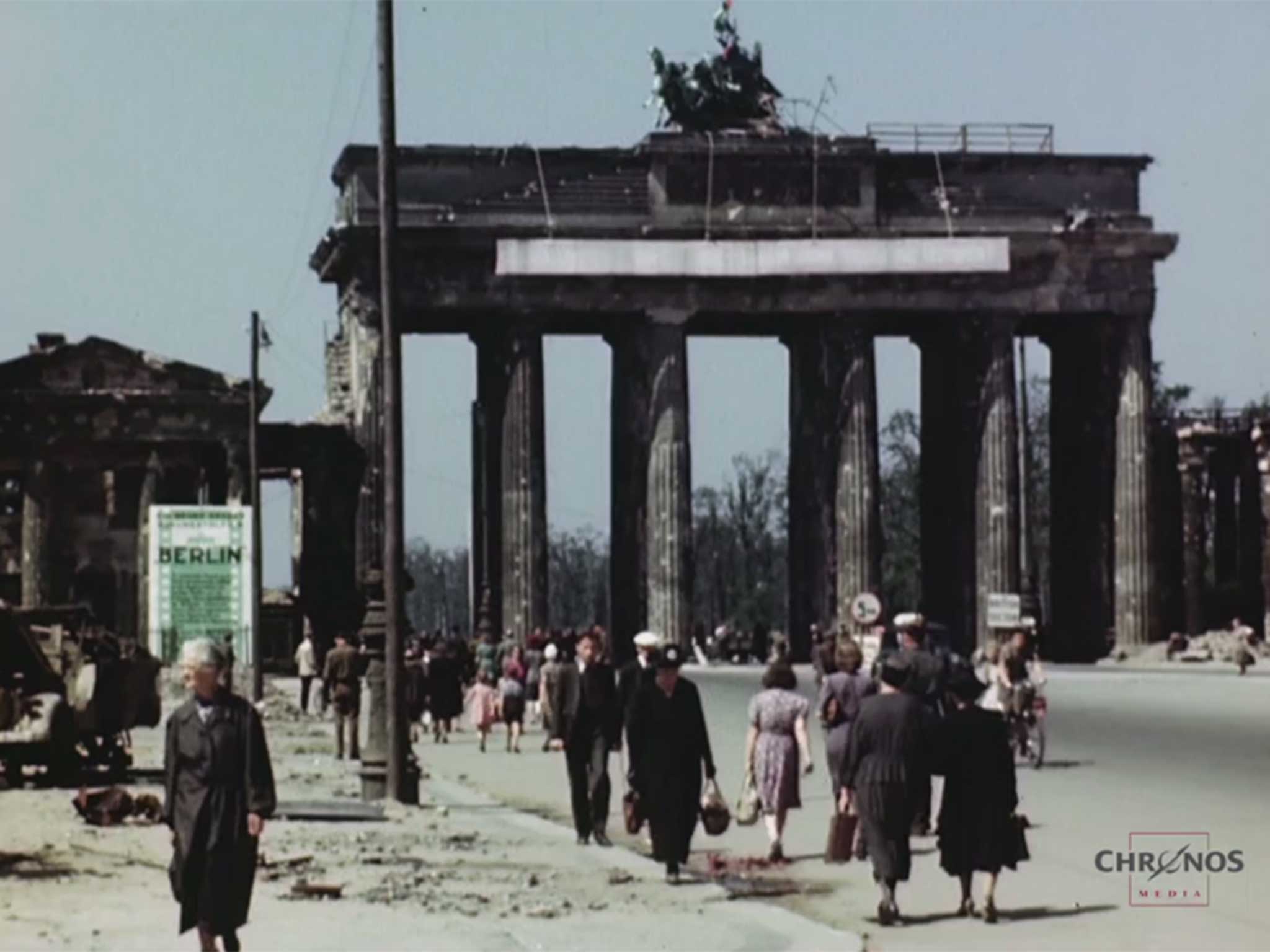 The footage shows the calm of everyday life - people cycling, shopping - juxtaposed with apartment blocks reduced to rubble, with notable landmarks like the Reichstag, Brandenburg Gate and Potsdamer Platz lying in ruins.