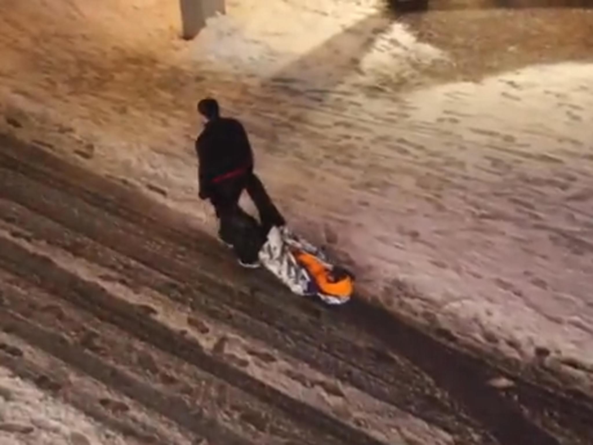 At one point, the man can be seen attempting to resist being dragged, but after a couple of tries at sitting up decides it's too much effort and lies down again.