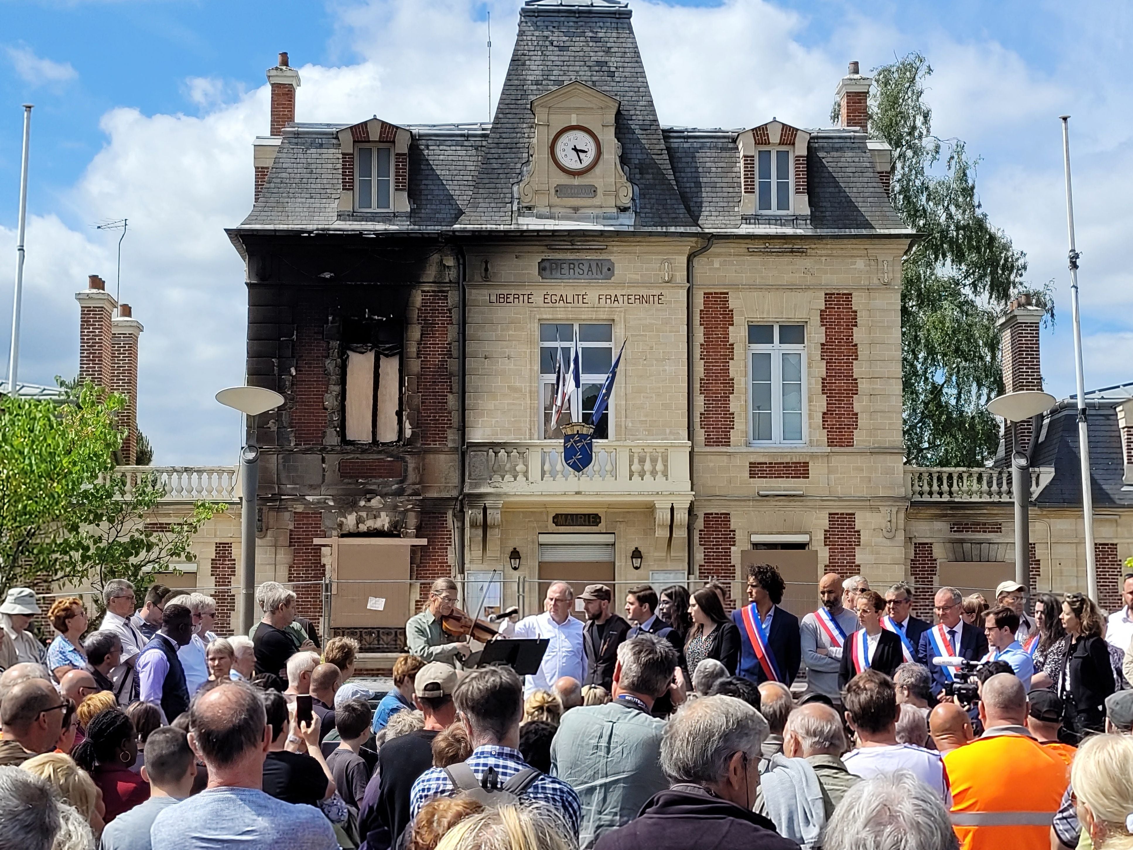 Participants attend a nationwide action in front of town halls, after rioters rammed a vehicle into the Mayor’s house injuring his wife and one of his children overnight, in L’Hay-les-Roses, south of Paris.