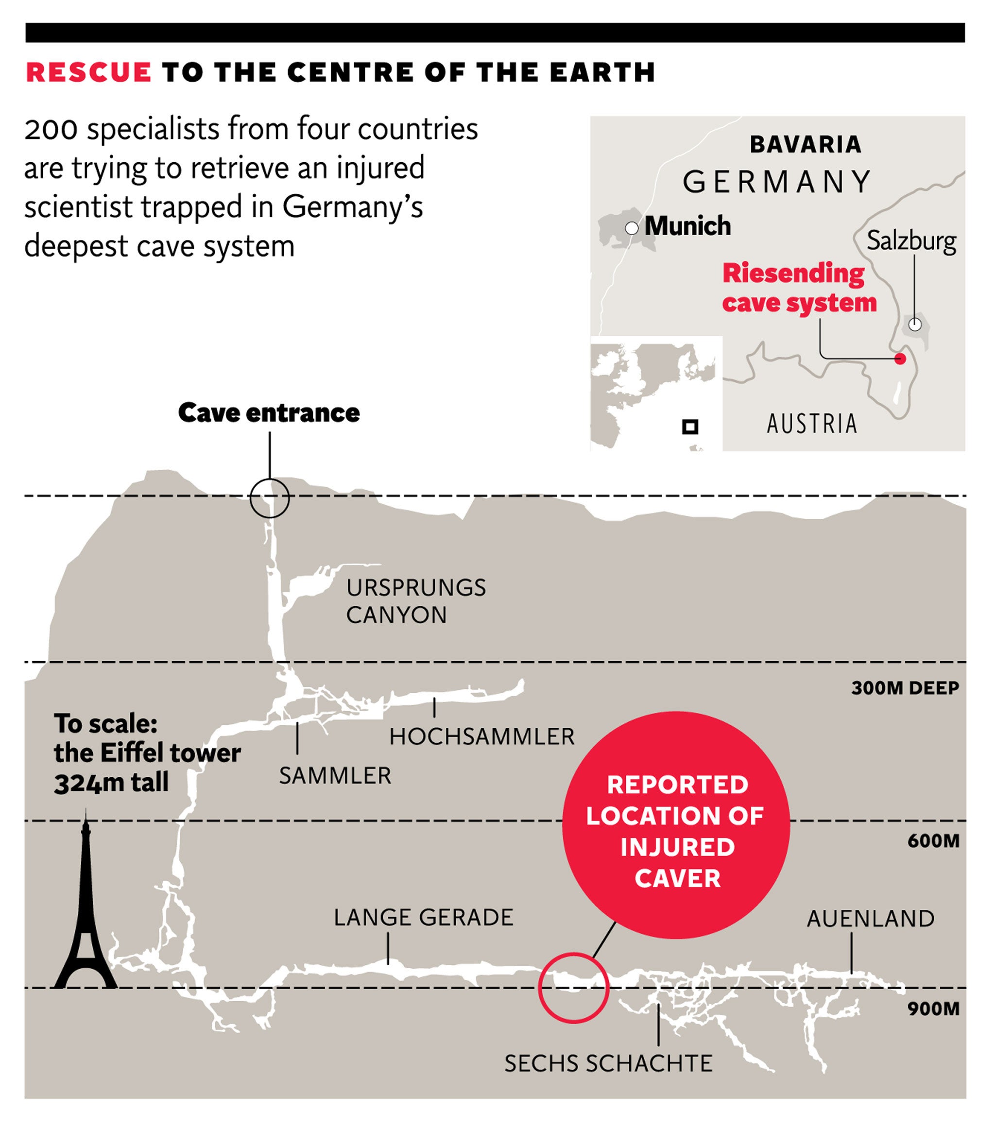 Riesending is Germany’s deepest and largest cave system, with a 19.2-km (11.9-mile) network of paths extending to a maximum depth of 1,148 metres (3,766 feet). Climbers and doctors from Germany, Switzerland, Austria and Italy have all been involved in the challenging rescue.