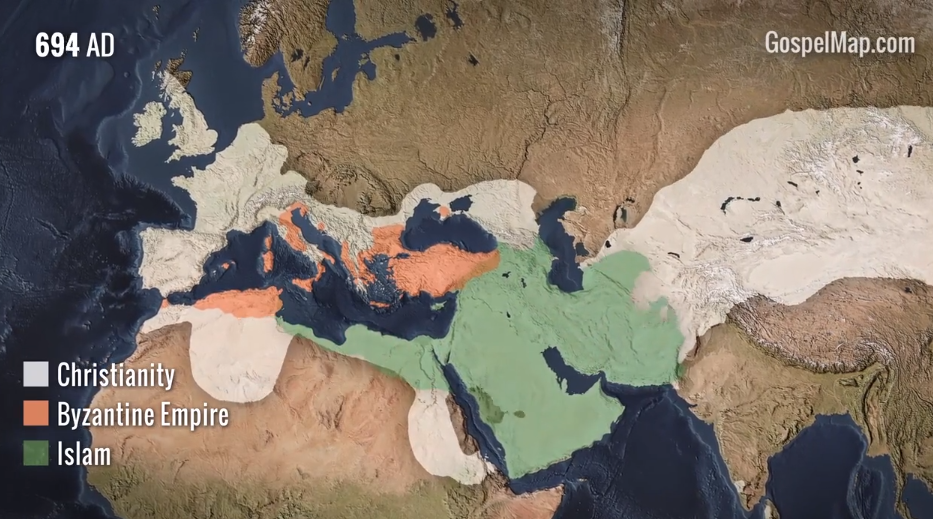 The video begins with the Roman empire and shows Christianity sprouting up on its margins, then spreading elsewhere. Islam follows suit a bit later, moving rapidly through the crumbling Byzantine and Sassanian empires, through North Africa and into parts of Europe. They both inexorably expand thereafter.