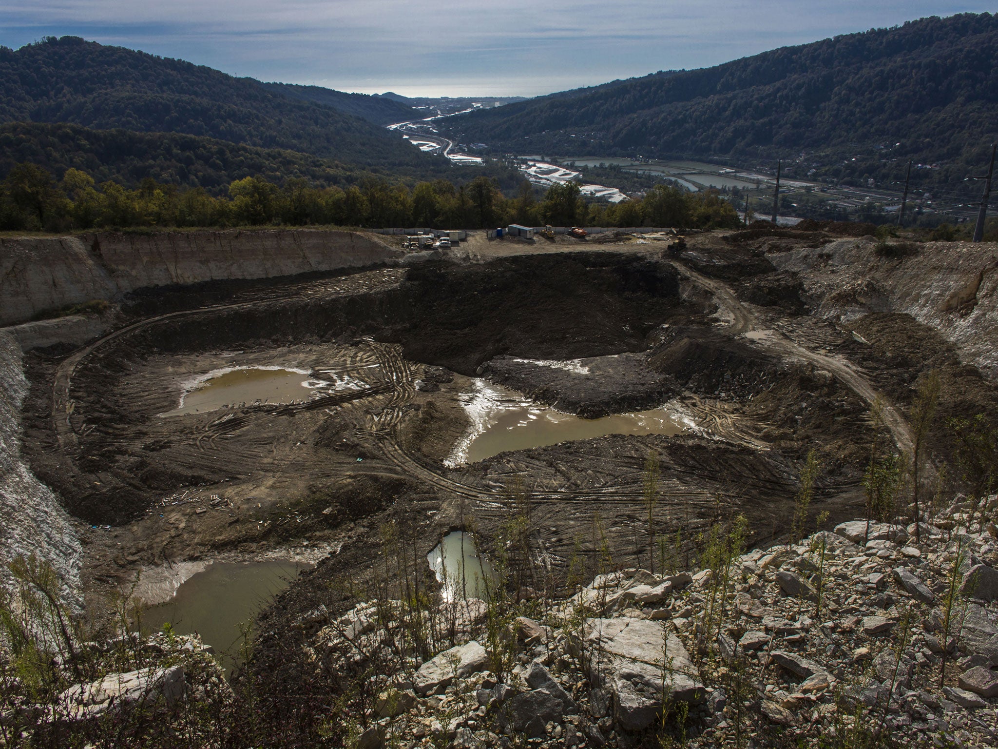 In Akhshtyr near Sochi, at the same time Vladimir Putin assures the world that February's Games will come at no cost to the environment, locals have stopped swimming in the river Mzymta. They claim that pollution from dumps, where construction waste from the Games has been covertly disposed of, means they cannot sell the kurma fruit that grows in the village because it is covered in limestone dust.