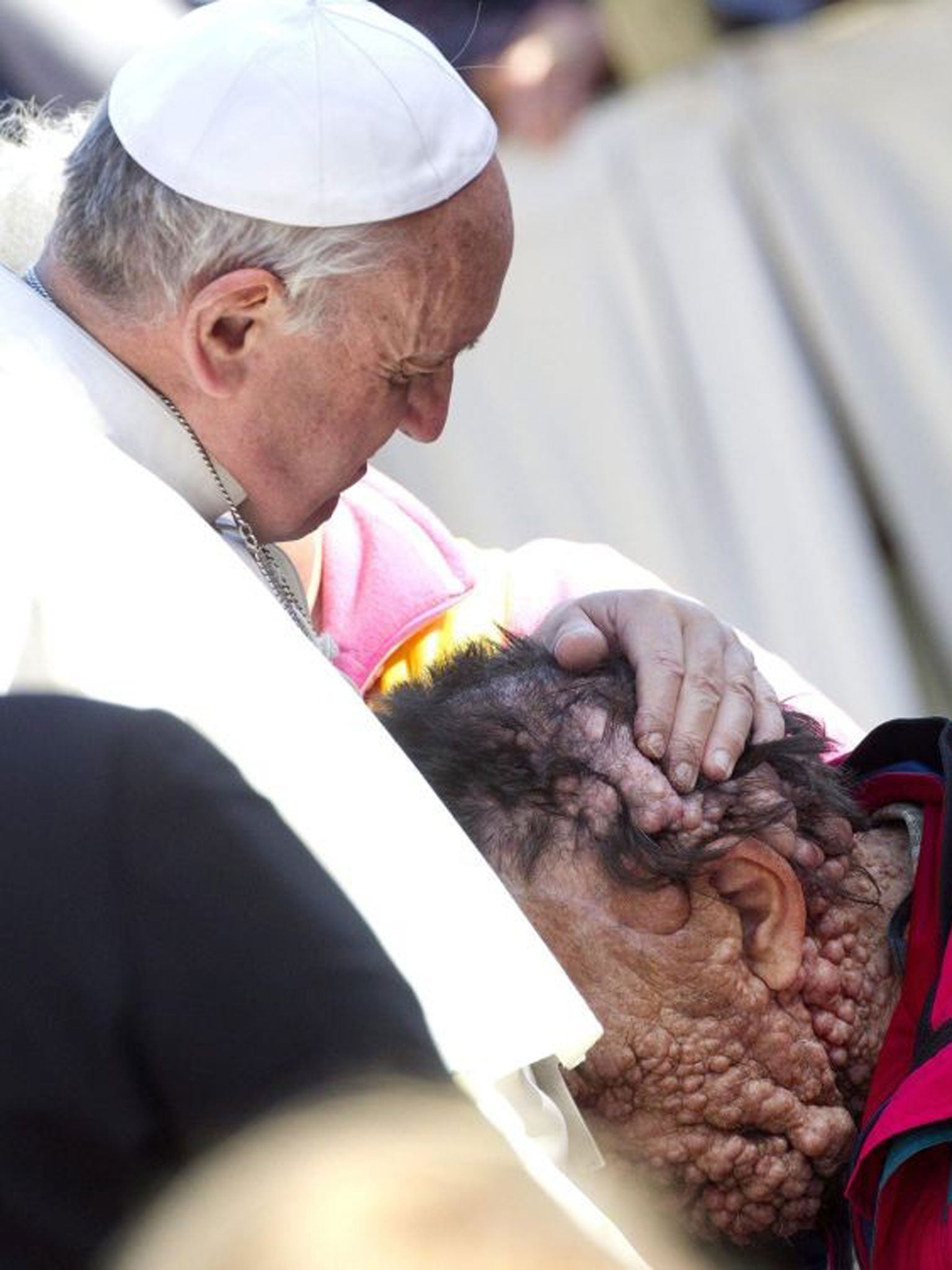 In a moving image that conveys compassion and humanity, Pope Francis was pictured yesterday tenderly comforting a man suffering from a rare disease that has caused him to develop neuronal tumors all over his body.