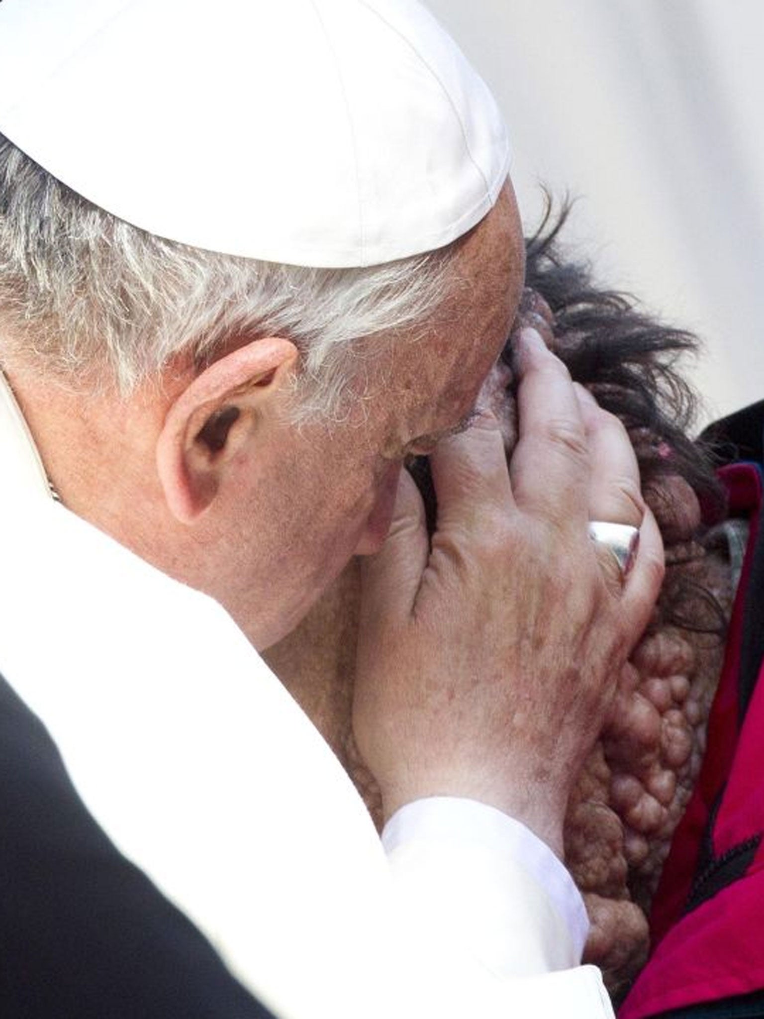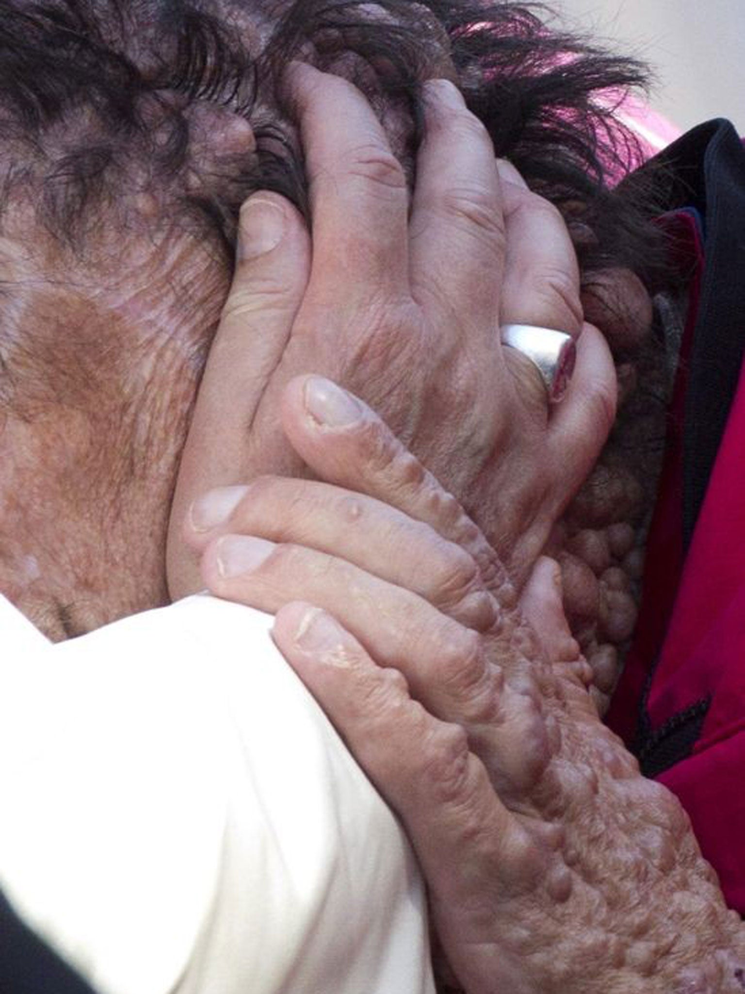 Moving photographs show Pope Francis embracing man disfigured by disease
