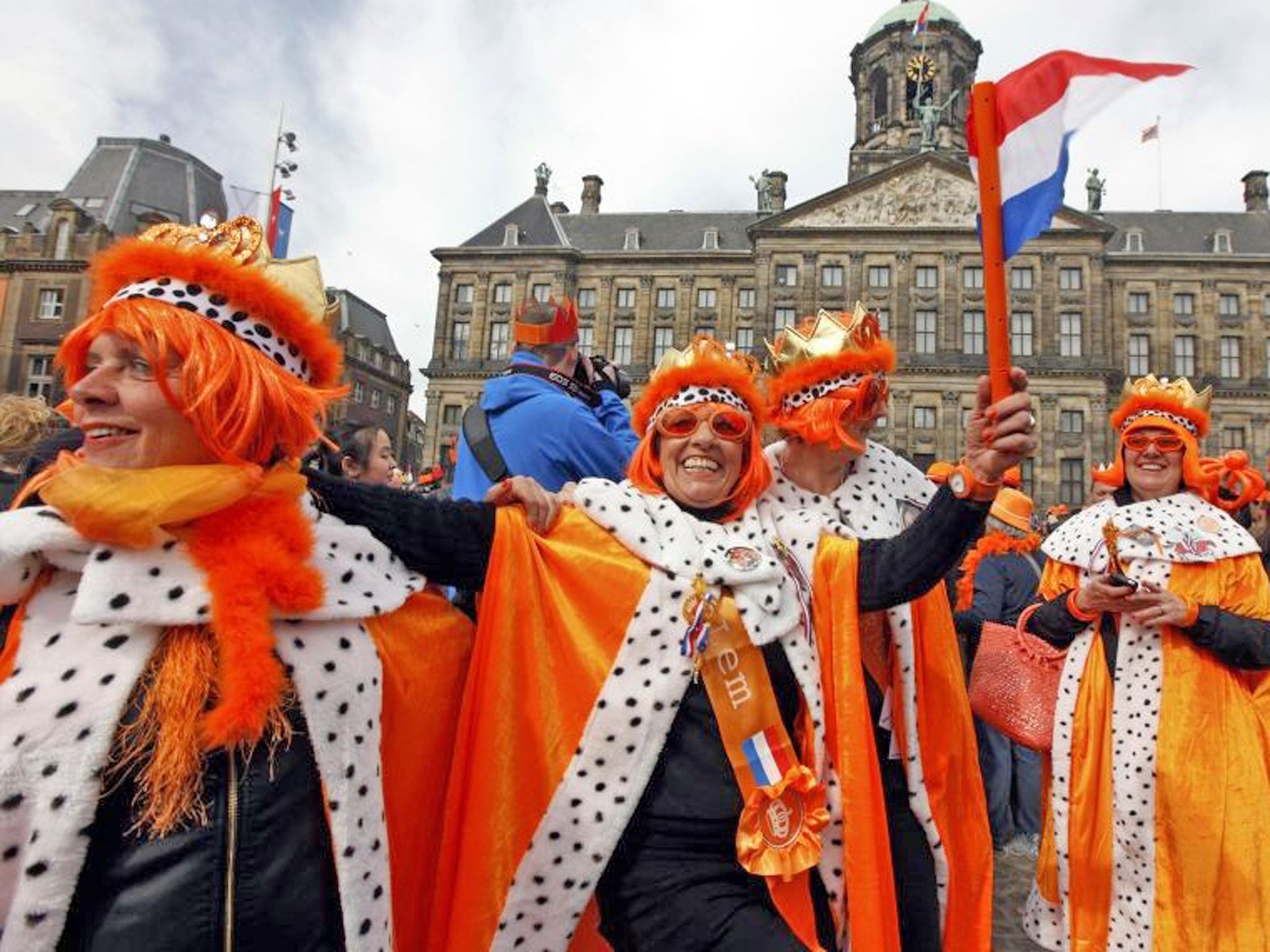 Being at ease did not appear too much of a problem for his subjects as they packed the streets of Amsterdam, beer cans in hand and bobbing up and down to thumping beats from speakers throughout the city. In their orange dungarees, orange wigs and inflatable orange crowns, people spilled out of windows, onto balconies, onto bridges and into the streets.