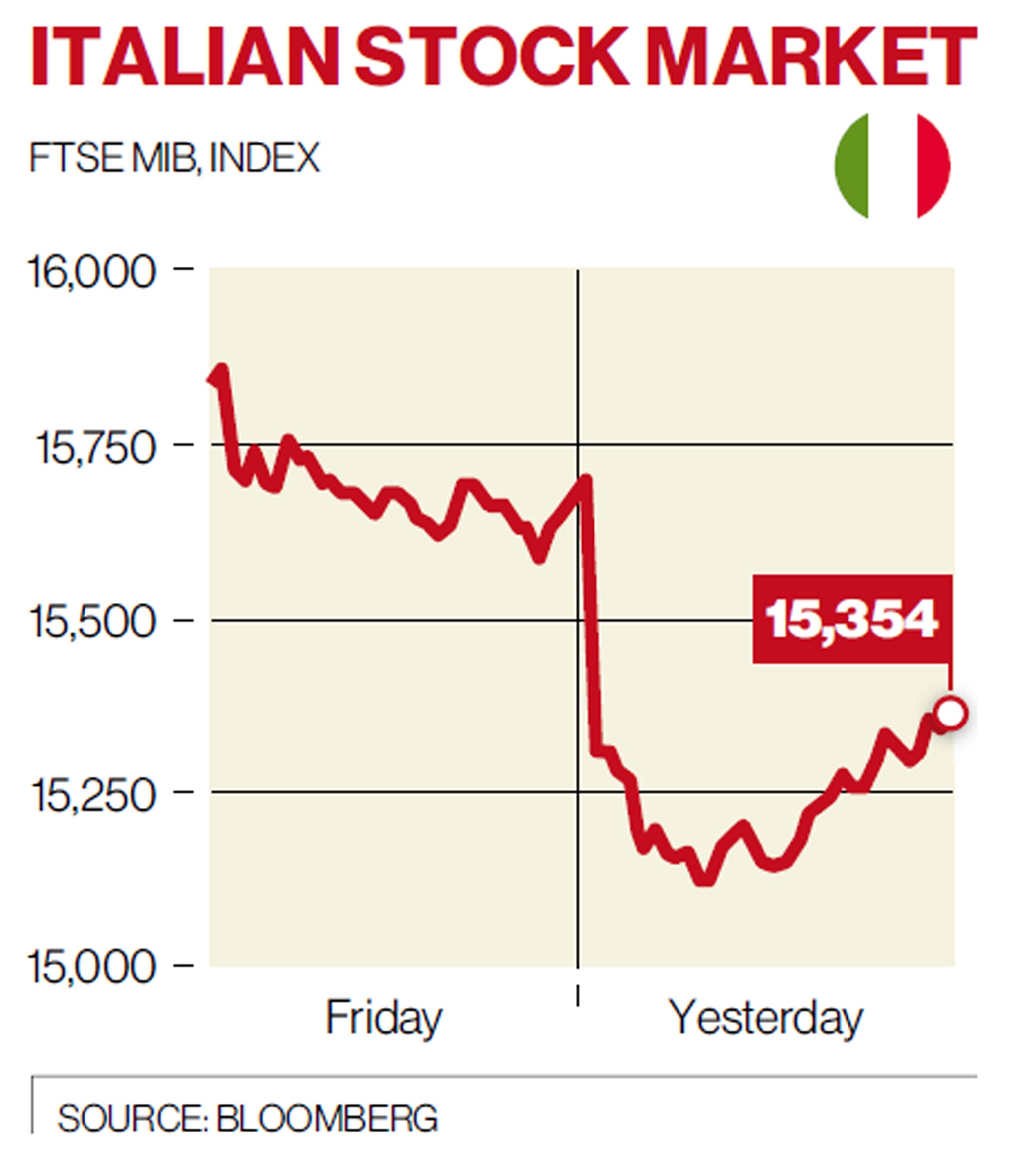 Within hours of opening, Milan's stock exchange had fallen nearly four per cent and Italy's borrowing costs shot up as markets tried to make sense of the chaotic political scene following Prime Minister Mario Monti's announcement at the weekend that he plans to resign. By close, Italy's main FTSE MIB stock index had fallen 2.2 per cent to 15,354.