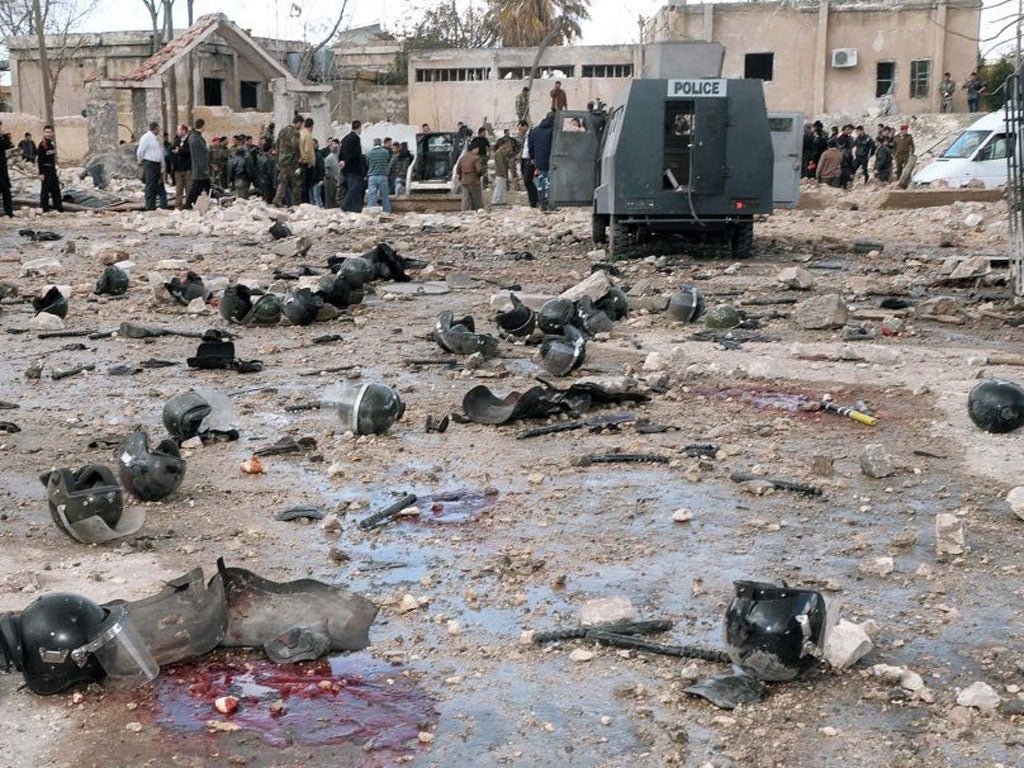 One of the blasts tore through a street outside the city's Military Intelligence Directorate. Footage broadcast by state television showed rubble strewn over the road and five corpses lying under blankets to one side of the street.