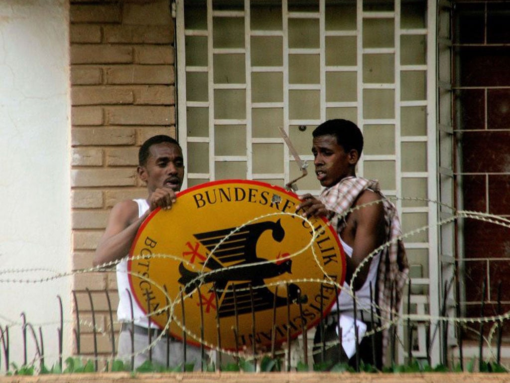 The German mission was attacked when up to five thousand protesters gathered in the Sudanese capital to express their outrage over the California-made film, although, aside from the general anti-Western sentiment, it is unclear why European interests were attacked. Part of the compound was torched, while some protesters clambered on to the roof and replaced Germany's colours with a black shahada flag, the banner sometimes flown by religious conservatives, which carries the Muslim declaration of faith.