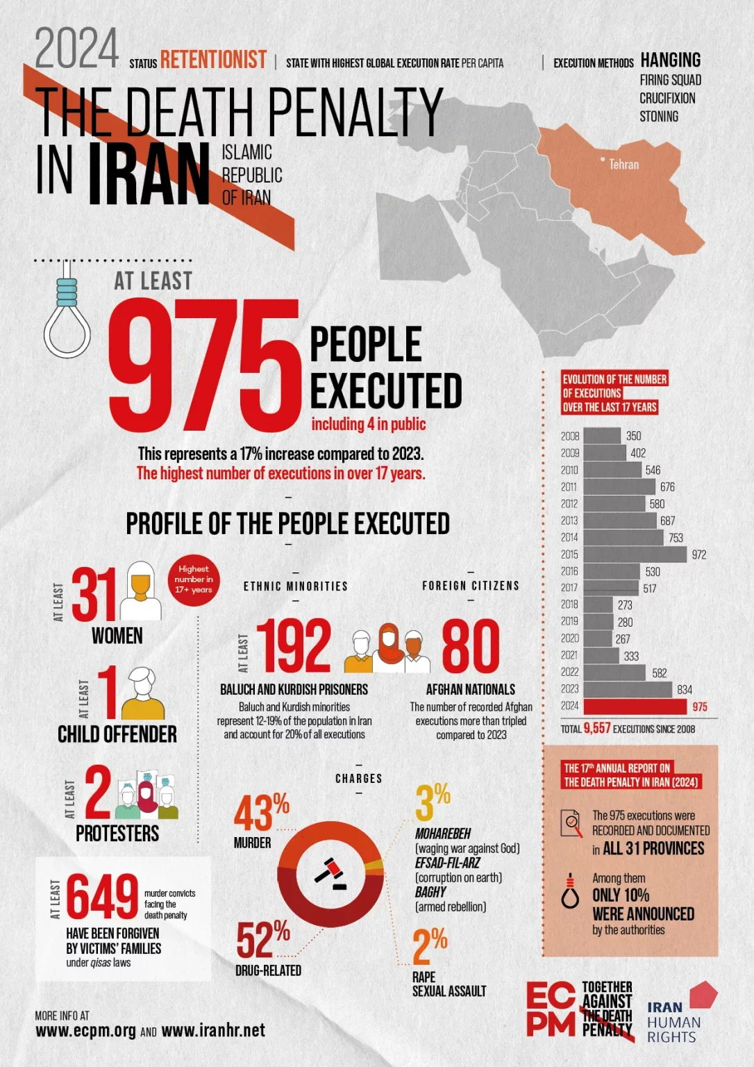 - At least 975 people were executed in 2024, a 17 per cent increase compared to 834 in 2023. Only 95 executions, or less than 10 per cent, were officially announced.