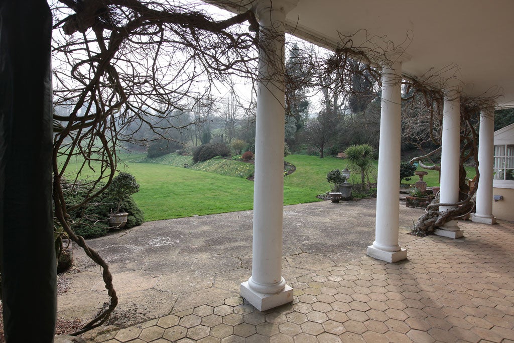 The handsome park railings which curve down alongside the drive, divide the garden from the sloping land below, with a lake, made in 1990, sitting at the bottom. An osprey once came to inspect the lake, said John Tremlett, but sadly decided not to stay. Moving round the house, under the loggia, where vast old wisterias wrap themselves round the columns, you look out over a huge lawn, carved out of the slope, said Julia Tremlett, for her grandmother's coming-of-age party in 1912. She was very keen on tennis and there's room here for two grass courts, side by side.