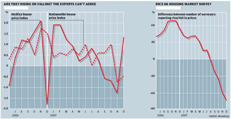 In such volatile times for both the housing market and the general economy, nervous homeowners and would-be first-timers have good reason to monitor the direction of property prices as they confront the possibility of negative equity or try to plot the right moment to buy or sell. But if they looked at last month's two major indices for bricks and mortar, their uncertainty will only have increased, as the figures told completely conflicting stories.