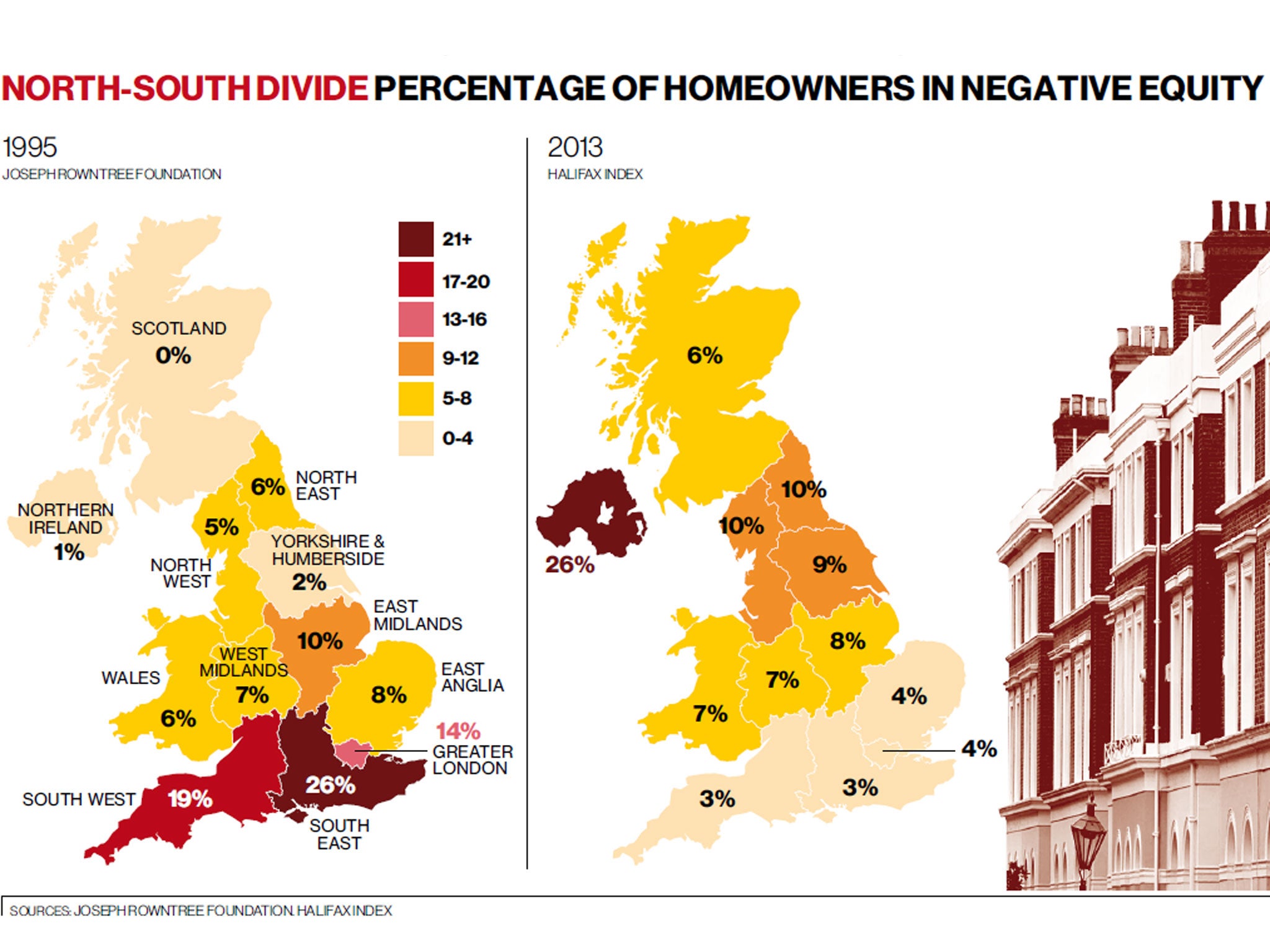 During the 1990s, negative equity was concentrated primarily in the South but this time around, the recession has hit the northern regions hardest, putting more homeowners in the North under pressure. The latest figures from property website Hometrack underlined the north-south split in the housing market as prices are buoyed by a lack of supply of homes and increasing demand.