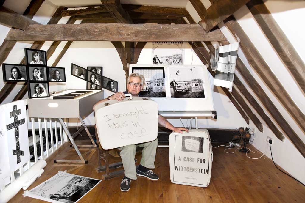 Of course, he's being modest. After studying at Goldsmiths and the Slade School of Fine Art, Grylls found acclaim as an artist in the late 1960s with his pieces dubbed "pun sculptures". He still has several of these – including the packing cases you can see him with here. Entitled A Case for Wittgenstein, they were part of his show at the ICA in 1969, after his graduation work was spied by art critic (and ICA assistant director) Jasia Reichardt. "I used to go to see Wittgenstein's lectures; of course I didn't understand them, but his picture theory of language made sense to me: he said, 'Statements are only meaningful if they can be pictured in the real world.'" And so, Grylls gave statements solid forms – in this case, two white suitcases purchased from BHS on Oxford Street.