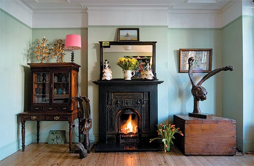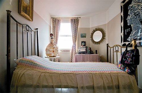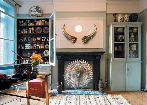Upstairs, a spare room is dominated by a brass bed that was bought from the local "emporium" Ronnie Scott's. "It's great for people with a love of objects," she enthuses. "He just collects things; it's like a house clearance but on a much bigger scale. If you go there asking for coal hods, say, he will take you to a room with 50 of them." A delicate figurine made from shells part of a commission the artist recently won in Margate sits on a bedside table and gives the room the feel of a doll's house. "It's nice to have a room that, although it's lived in, is a bit more precious," she explains. The paint changes colour as it rises up the wall, at about the midway point. "I thought that must be a good idea. It makes the room feel a bit more antiquated. The colours are nice, sleepy, gentle colours, muddy almost."