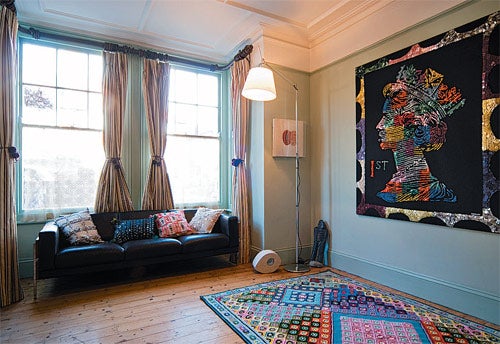 The front room is contrasted by her back room, which she uses as an office. Here, the colours are much brighter, which helps her to work. The walls are painted grey-blue to match the curtains, and any artwork that didn't match has been banished. The Spode china is evidence of her love for all things British, as is the 1950s Selfridges Christmas decoration. Here, also, are the jars of specially dyed multicoloured beads and buttons that she uses in her work. Berber tribal rugs from Marrakech finish the picture.