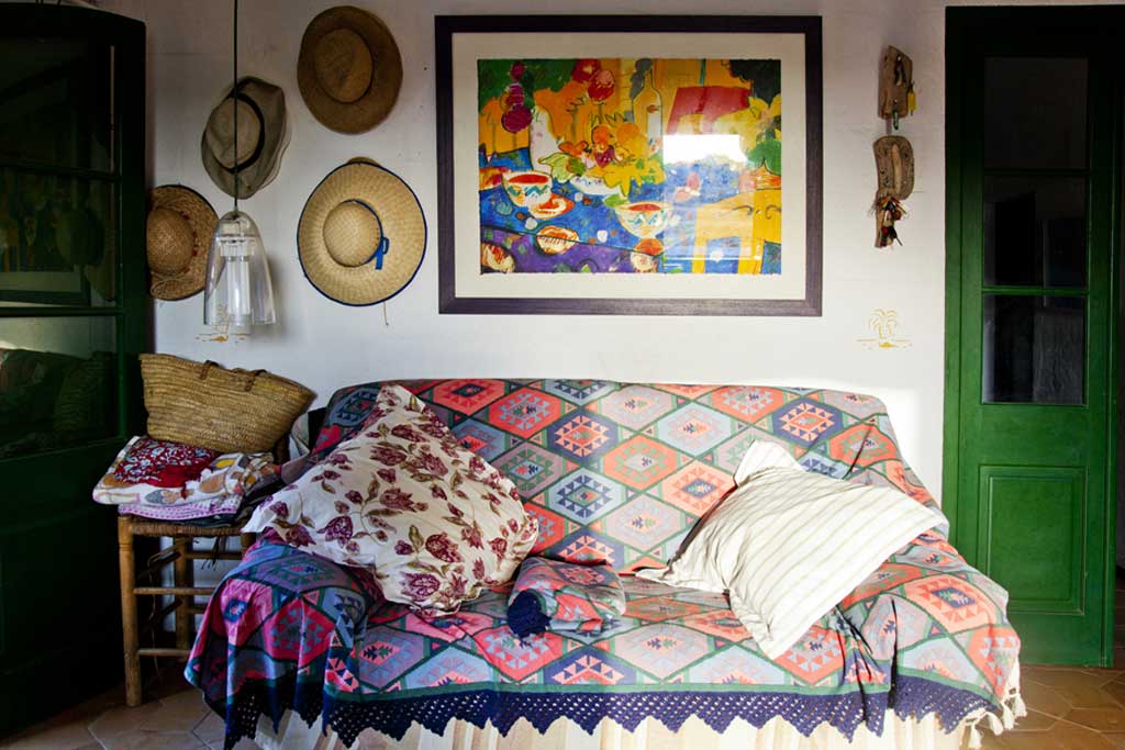 What are these favoured sons, then? Above his bed is an oil painting of Alaior, a nearby Menorcan village. "When I started, it was very difficult to do my first painting of the village… this was the first [time] I was satisfied," says Anoro. Adorning the wall of their "living and dining and everything room" is a lithograph of one of his favourite works, a zingy still life, while over the sofa hangs a piece entitled Looking Outside: "The secret here is a new colour combination that made me happy at the time."