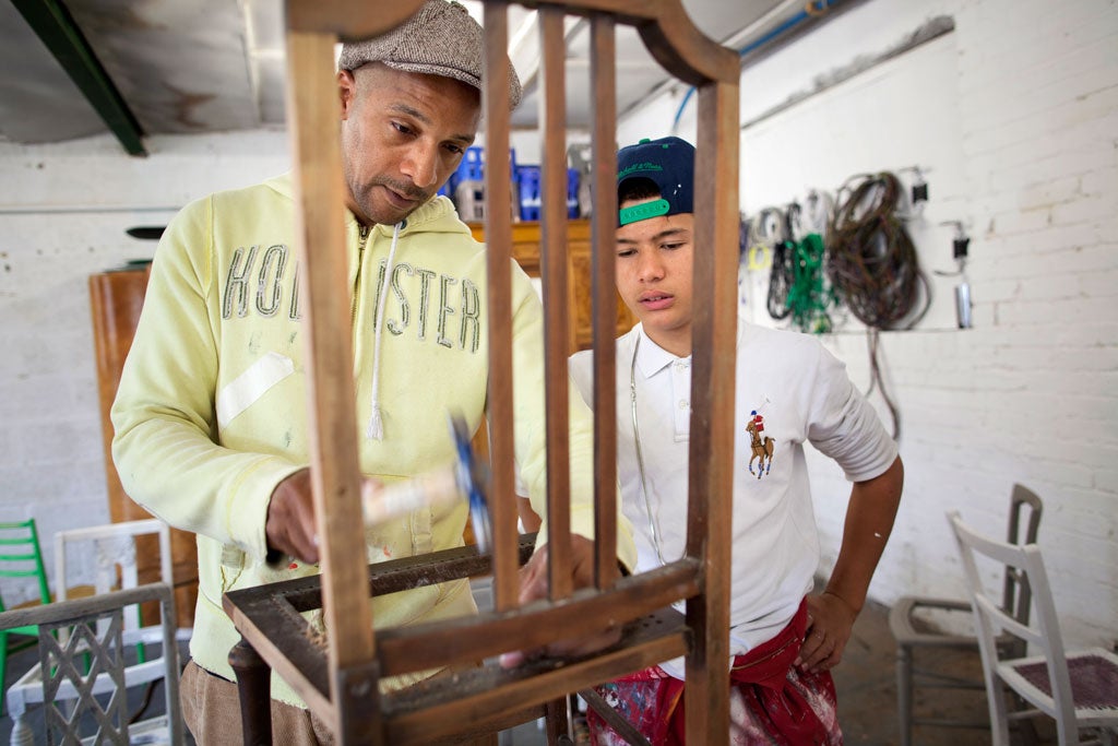 Except that, of those restorers who are old enough to have a bank account, most would struggle to squeeze too much vintage furniture into their teenage bedrooms. The average age of the restorers here – buffing battered sideboards and chairs to a soundtrack of gangster rap and R&B – is around 15.
