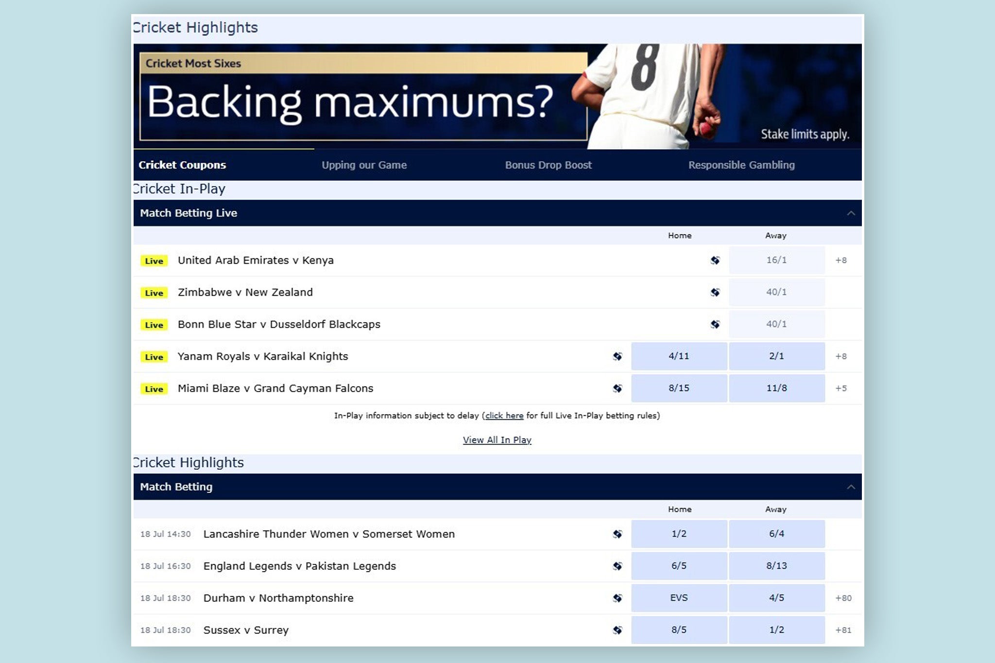 ✓ Good selection of cricket offers and boosts | ✗ No betting app |