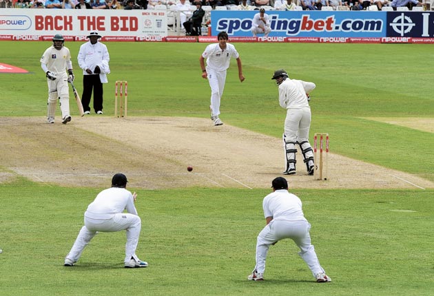 Before lunch he had sent back the Pakistan captain, Salman Butt, persuading him to jab at a ball moving away late. After lunch, batsmen were falling over each to be dismissed. Anderson's second wicket was a thing of beauty as he came round the wicket to the left-handed Imran Farhat, slanted the ball in and then darted it away at the last to confound the batsman and remove his off stump.