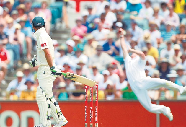 It was clear Ponting had decided he must impose himself on proceedings and immediately struck three fours, though one was edged hard through a vacant area where fourth slip might have been. But he looked agitated in his determination and it was no surprise when he went hard at a ball from Jimmy Anderson. Paul Collingwood took a memorable diving catch at third slip.