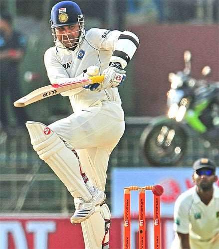 Sehwag looked in bright form right from the start of India's innings, and he picked out paceman Dammika Prasad for special treatment, carting three boundaries in the third over to signal his intentions. Debutant spinner Suraj Randiv had a less than memorable start to his Test career, smashed for two boundaries by Sehwag in his first over. Sehwag reached a run-a-ball fifty in typical style – with a boundary off Dilhara Fernando – as India held their nerve to safely negotiate the final few overs of the day.