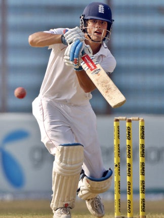There was some debate about whether it grazed the bat on its way to his helmet and thence to wicketkeeper Mushfiqur Rahim's gloves, and Trott was clearly with the motion that it had not. He stood his ground for longer than any umpire would have liked and then bashed with his bat an innocent plastic chair that was standing on the boundary. This at least brought together the two protagonists who most wanted to see. Cook set off in a manner which suggested he had a century and nothing else on his mind. Pietersen was of like disposition and it is difficult to recall any Test innings where his bat had been quite so vertical throughout.