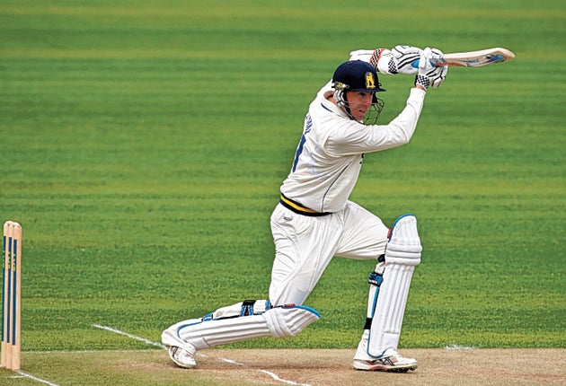 Dropped twice earlier in the day, the all-rounder has not offered a chance in the second innings thus far. He and Ateeq Javid, the England Under-19 batsman, have put on 64 since Jim Troughton retired hurt at 129 for 3, the youngster coping well with Tino Best's attempts – verbal as well as physical – to intimidate him.
