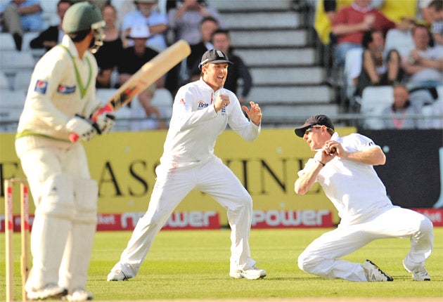 He could hardly have chosen a more appropriate time considering the standard of England's work at Trent Bridge. All three of the regular slips – Andrew Strauss, Graeme Swann and Collingwood – took sharp chances.