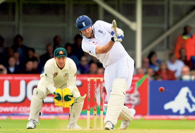 Onions claimed the wicket of Katich and then came the most devastating blow for the Australians when Graeme Swann sent a superb fizzing ball into Ricky Ponting's stumps. Flintoff, naturally, was at the heart of the celebrations. Once again he had produced an extraordinary surge of performance, the kind which is now, hauntingly, about to disappear. However, that still is a little time into the future and Flintoff, weary and hurting, remains at the heart of his team.