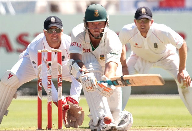 Swann could do nothing about a vicious lifter which homed in on his gloves and went to slip. Next ball Jimmy Anderson edged in the same direction. Only the selflessness of Prior, who played some superbly improvised attacking shots took England to within 18 runs of South Africa's total. Any suspicion that England would benefit from the early-morning Newlands nibble was swiftly allayed. True, Ashwell Prince was almost the victim of a dreadful decision when he was given out caught behind down the leg side. Although that was duly reversed, Prince went soon after, Swann's 27th lbw victim of the series, and the batsman's request for a review was the act of a desperate man who needed a stay of execution because he needs runs.