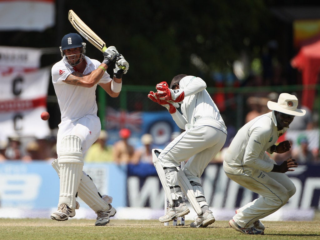 Tillekeratne Dilshan, the occasional off-spinner who has been known to play the odd outrageous stroke himself, stopped in his run-up as Pietersen changed stance to switch hit. When eventually he bowled the ball, he fired it down the leg side and Pietersen swatted him to fine leg for four.