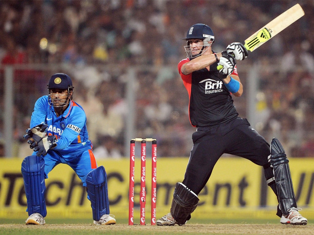 He might have withdrawn a couple of days earlier, but he was determined to give himself every opportunity and it paid off in style. Pietersen was at his best, as irrepressible as he was innovative. Crucially perhaps, he was dropped off a top-edge sweep on one. Of the three sixes in his 53 from 39 balls, the first, a reverse hit way over what would have been cover, was of the highest order.