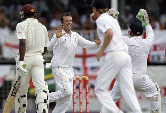 The man who was the oddest choice in England’s team proved also to be the most inspired. Graeme Swann, their off-spinner, took 5 for 57 in 24 overs. Had the match been held at the Sir Vivian Richards Stadium, Swann would not have played.